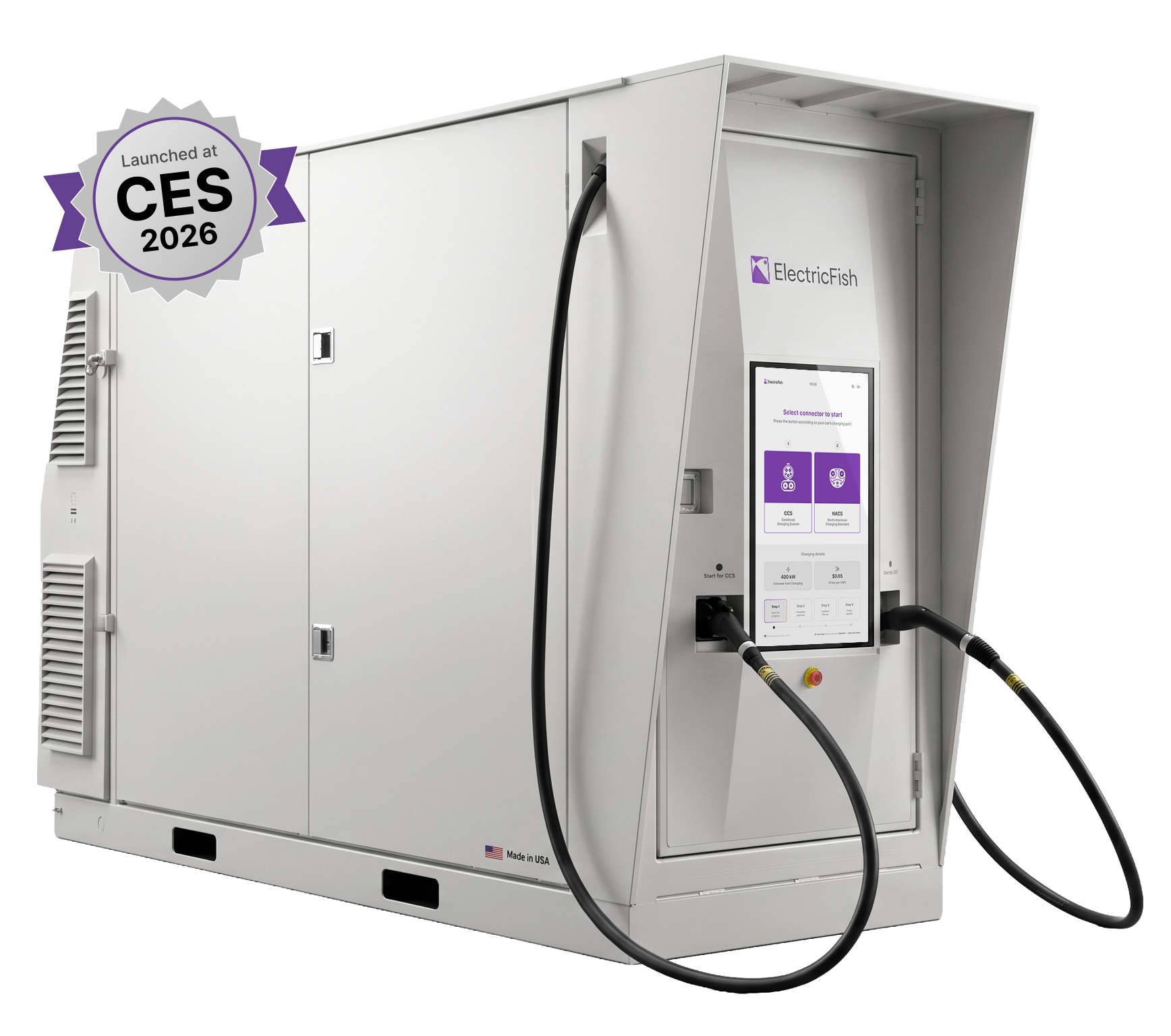 A battery-powered EV charger with energy storage. Each unit combines a 400 kWh battery with dual 400 kW fast-charging ports, delivering high-speed charging from a minimal, pre-existing grid connection.